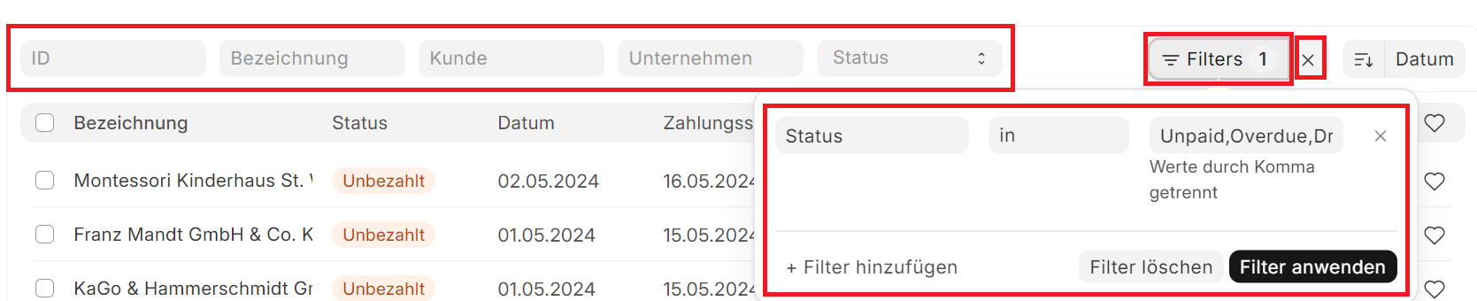 - Liste In der Liste kann man Filter anlegen um bestimmte Dokumente zu filtern. Hier gibt es einen Schnellfilter mit Textboxen und einen Filter Knopf, dort können weitere Eigenschaften von diesen Dokument eingeschränkt werden.
