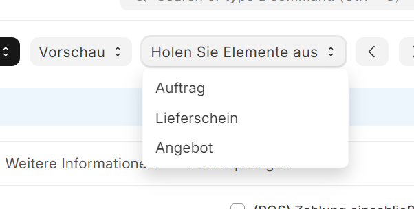 - Eintrag (Holen Sie Elemente aus) Hier findet ihr eine andere Liste die sich je nach Möglichkeiten unterscheidet, bei einer neuen Rechnung könnt ihr entsprechend alle Einträge aus ein Angebot, Auftragsbestätigung oder Lieferschein holen.