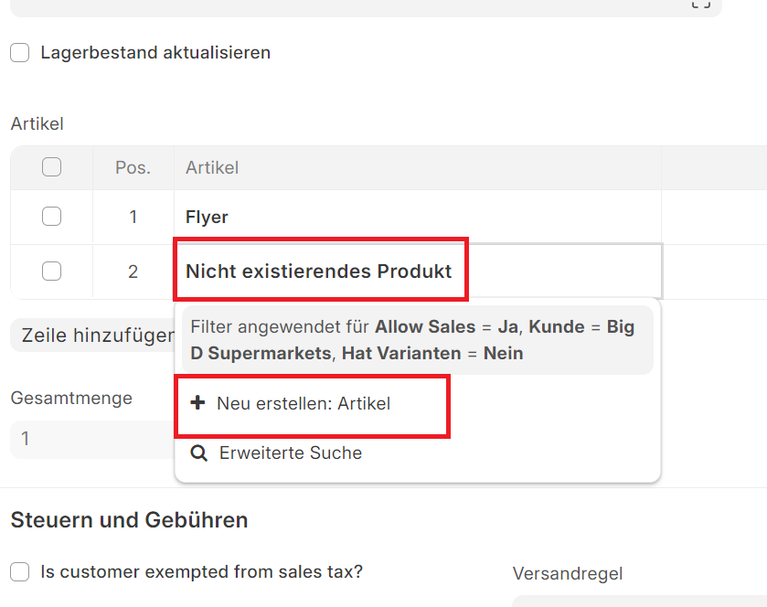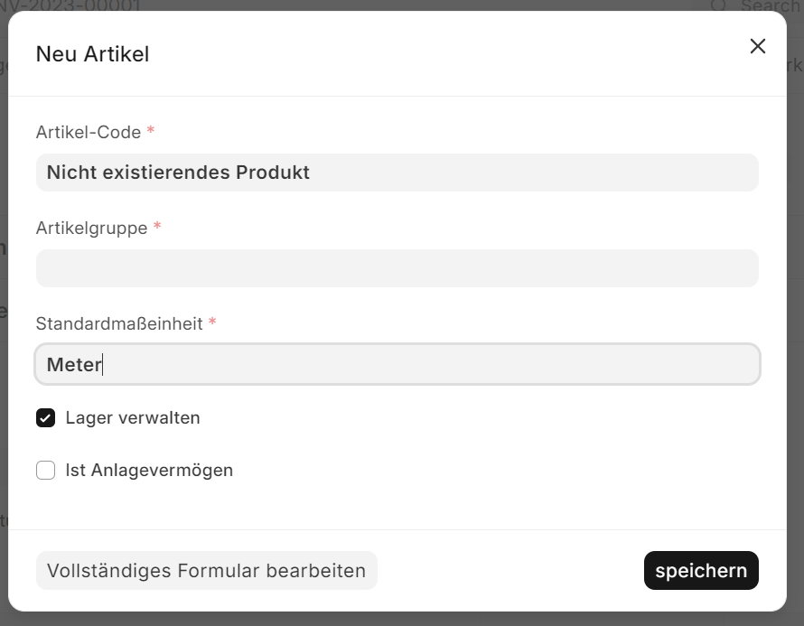 - Eine Schnellanlage von fehlenden Feldern ist ebenfalls möglich, zu beachten dabei ist dass man jeweils nur eine Schnellanlage offen haben kann. Dabei sucht ihr nach den Namen des Objekts, im Fall von Artikel wäre es der Artikelcode. Mit ein Klick auf Neu erstellen: Artikel übernimmt er, in diesem fall, den eingegebenen Namen bereits in den Artikelcode.