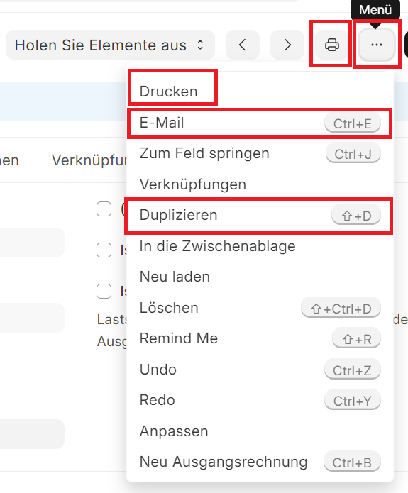- Eintrag Unter den drei Punkten befinden sich dann die Möglichkeit das Dokument per E-Mail zu versenden, das Dokument zu kopieren oder zu Drucken/Exportieren