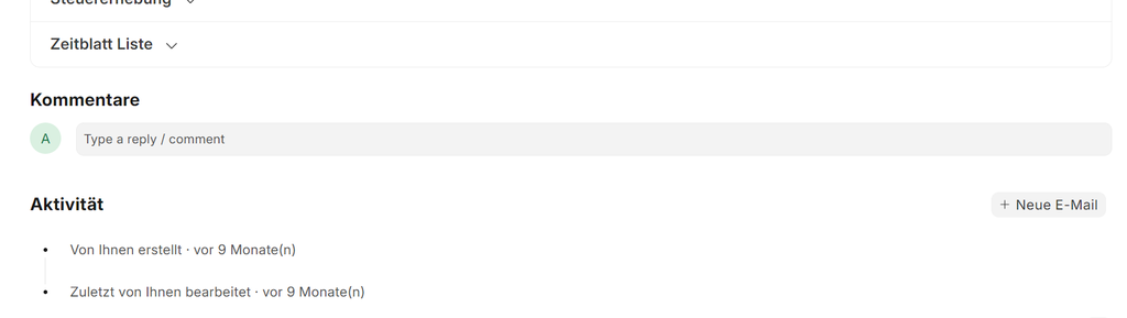 - Eintrag Zum Schluss gibt es unter jedem Dokument ein Kommentarbereich, hier können jegliche Kommentare eingegeben werden. Entsprechend kommen die neuesten oben hin und die ältesten sind ganz unten. Hier werden aber auch versendete E-Mails abgespeichert und wenn das System ein eingehenden Account hat, die empfangenen E-Mails abgelegt. Zusätzlich wird jegliche Änderungen an diesen Dokument (Rechnungen, Angebote, ...) protokolliert.