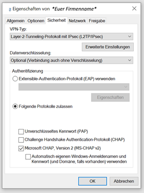 - Im Eigenschaftsdialog unter den Tab Sicherheit muss folgende Protokolle zulassen angehakt sein und Microsoft CHAP, Version 2