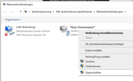 - Anschließend Rechtsklick auf euer neues VPN und Eigenschaften